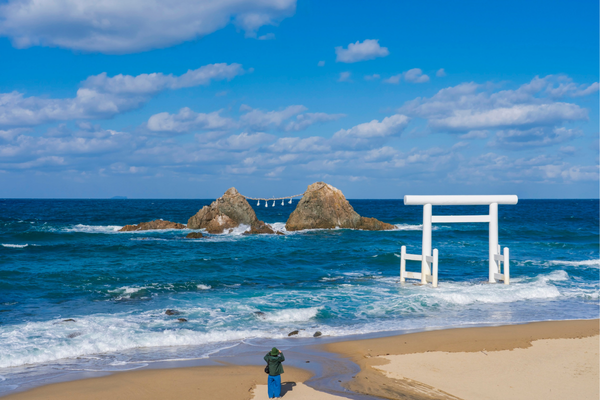 Cổng Torii trắng tinh khôi của đền Sakurai nổi bật giữa làn nước biển xanh thẳm. Phía sau là cặp đá phu thê Meoto-iwa, biểu tượng cho tình duyên và sự gắn kết. Đây không chỉ là điểm tham quan đẹp mắt mà còn là nơi linh thiêng để cầu nguyện may mắn trong chuyện tình cảm.